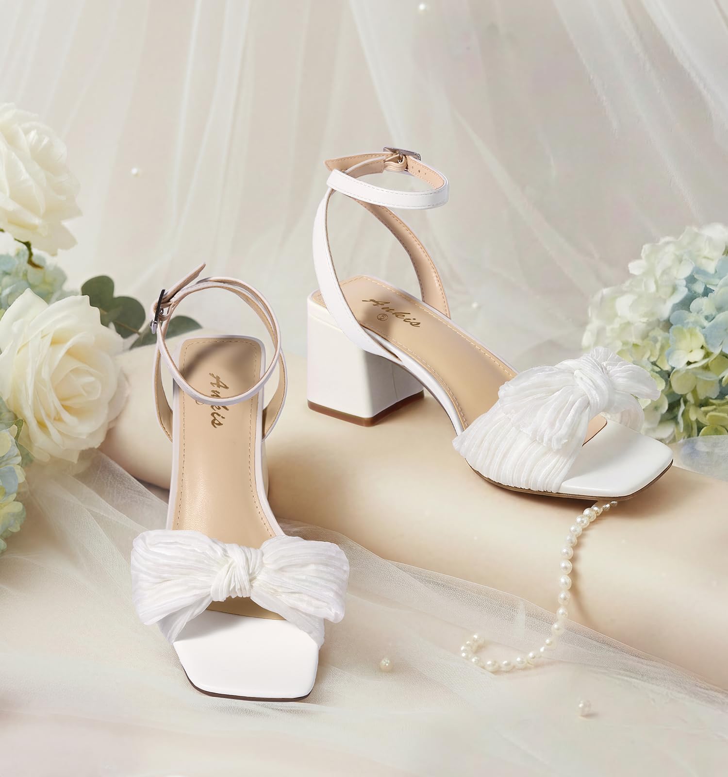 Ankis White Gold Blue Bow Women Heel Chunky Wedding Shoes for Bride 2.25 Inch Heel Open Square Toe Ankle Buckle Strap Dressy Pleated Comfortable Fashion Shoe Party Graduation Event 2026